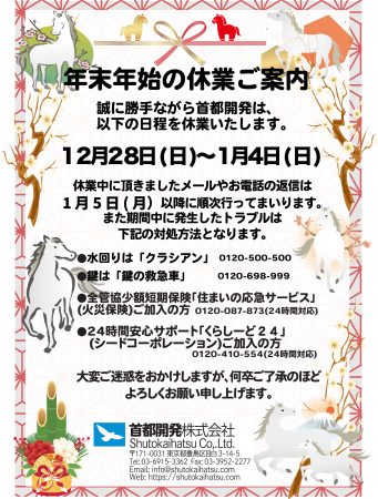 誠に勝手ながら首都開発株式会社は、下記期間中休業いたします。